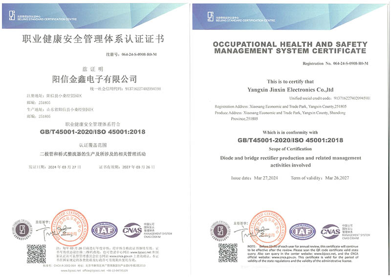 职业健康安全管理体系认证证书